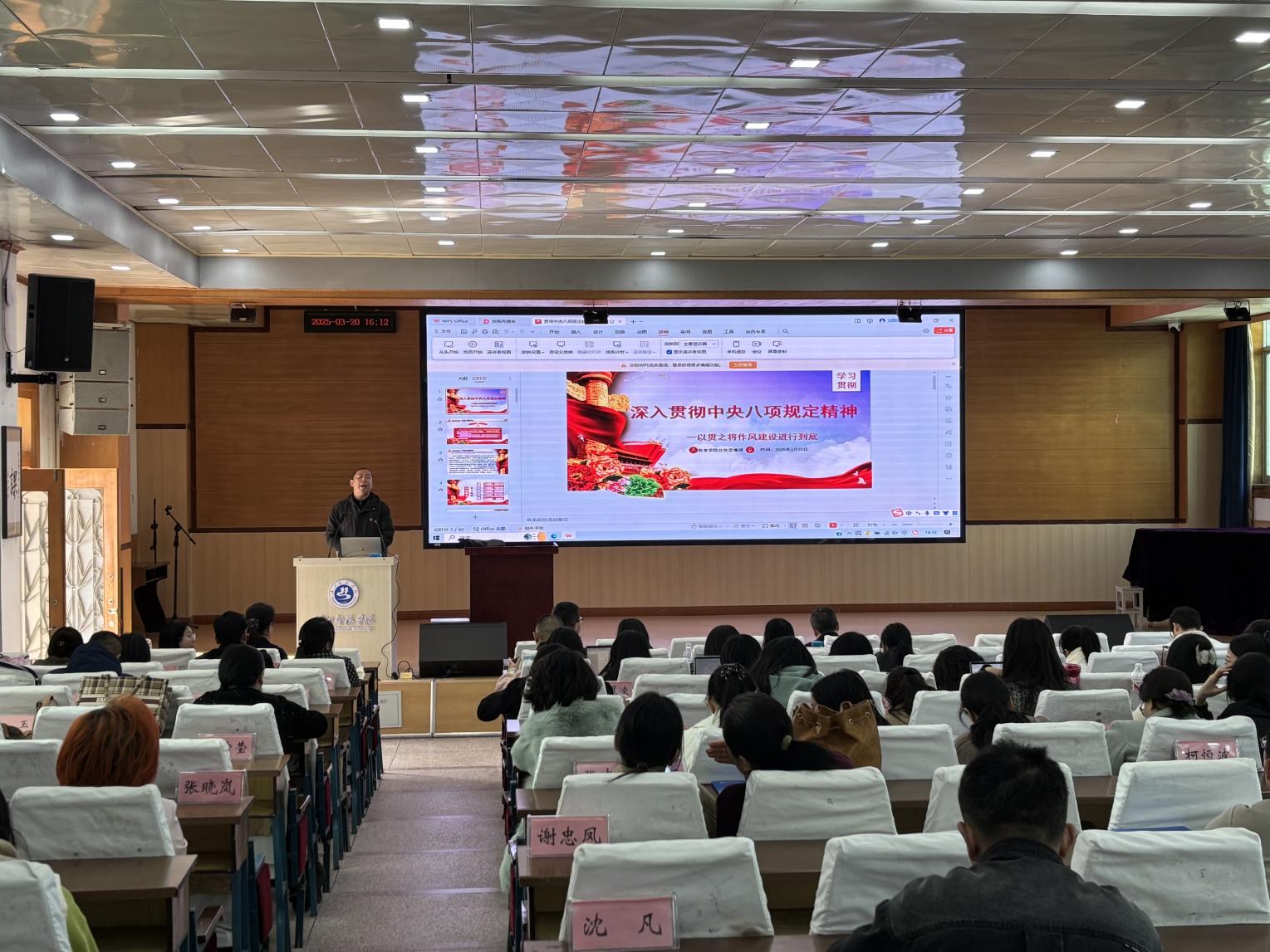 随后由分党委书记曹赟讲专题党课,他强调,在全党开展深入贯彻中央八项规定精神学习教育,是以习近平同志为核心的党中央从党和国家事业发展战略全局出发作出的重大决策部署,是今年党建工作的重要政治任务。他提出三点要求:一是提高思想认识,深刻领会本次学习教育的重大意义,引导党员、干部锤炼党性、提高思想觉悟,以作风建设新成效持续推动学院各项事业高质量、高水平、高速度发展;二是增强工作实效,准确把握学习教育目标要求,把学习教育同学院改革发展结合起来,两手抓、两促进,紧盯学院重点工作和关键指标,确保学习有质量、查摆有力度、整改有成效;三是强化宣传引导,依托学院官网、微信公众号等平台,宣传党中央部署要求,营造良好氛围。