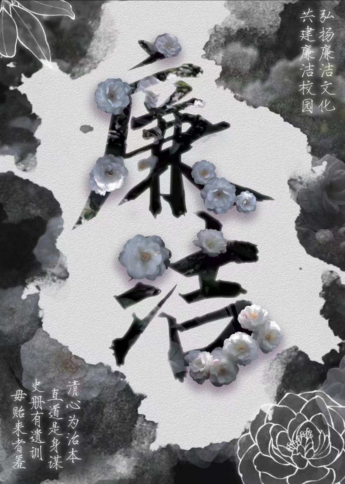 海报,书法与廉洁的结合,不仅是艺术与道德的交融,更是传统文化与现代价值观的契合。将抽象的廉洁理念转化为具象化的艺术表达,实现了思想性与艺术性的有机统一。这些作品为教院营造廉洁之风的道路上增砖添瓦,通过这种喜闻乐见的方式,让更多的人明白廉洁的重要性,从而让更多的人去追求廉洁,营造校园的廉洁风气。