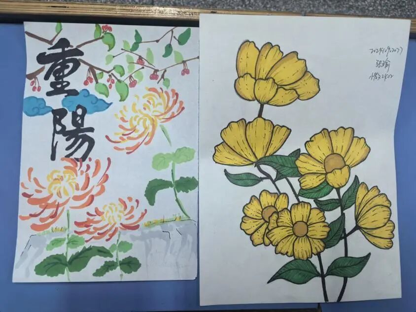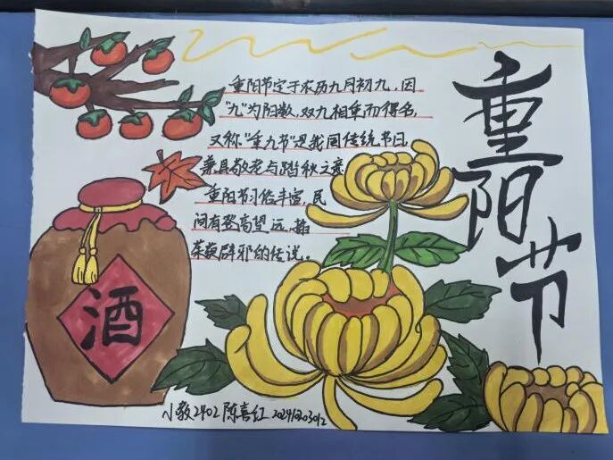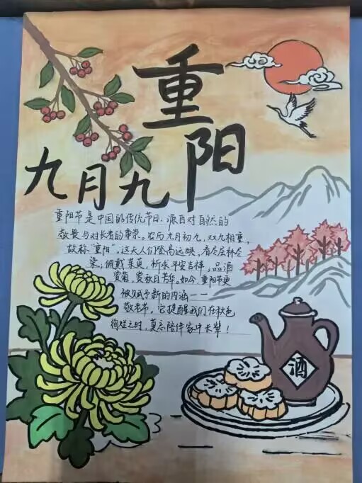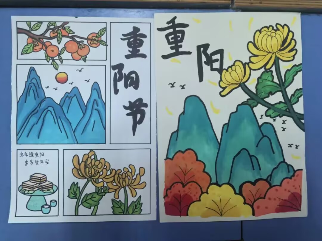 手抄报作品更是色彩斑斓,登高远山、绽放金菊、传统重阳糕、寓意吉祥的酒坛等元素跃然纸上,将“登高望远、赏菊饮酒、尊老孝亲”的重阳文化内涵具象化。